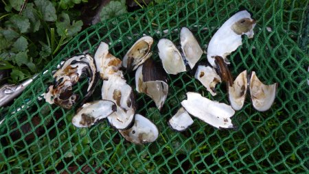 Leere Schalen der Bachmuschel mit deutlichen Fraßspuren durch den Waschbären - leider kein Einzelfall